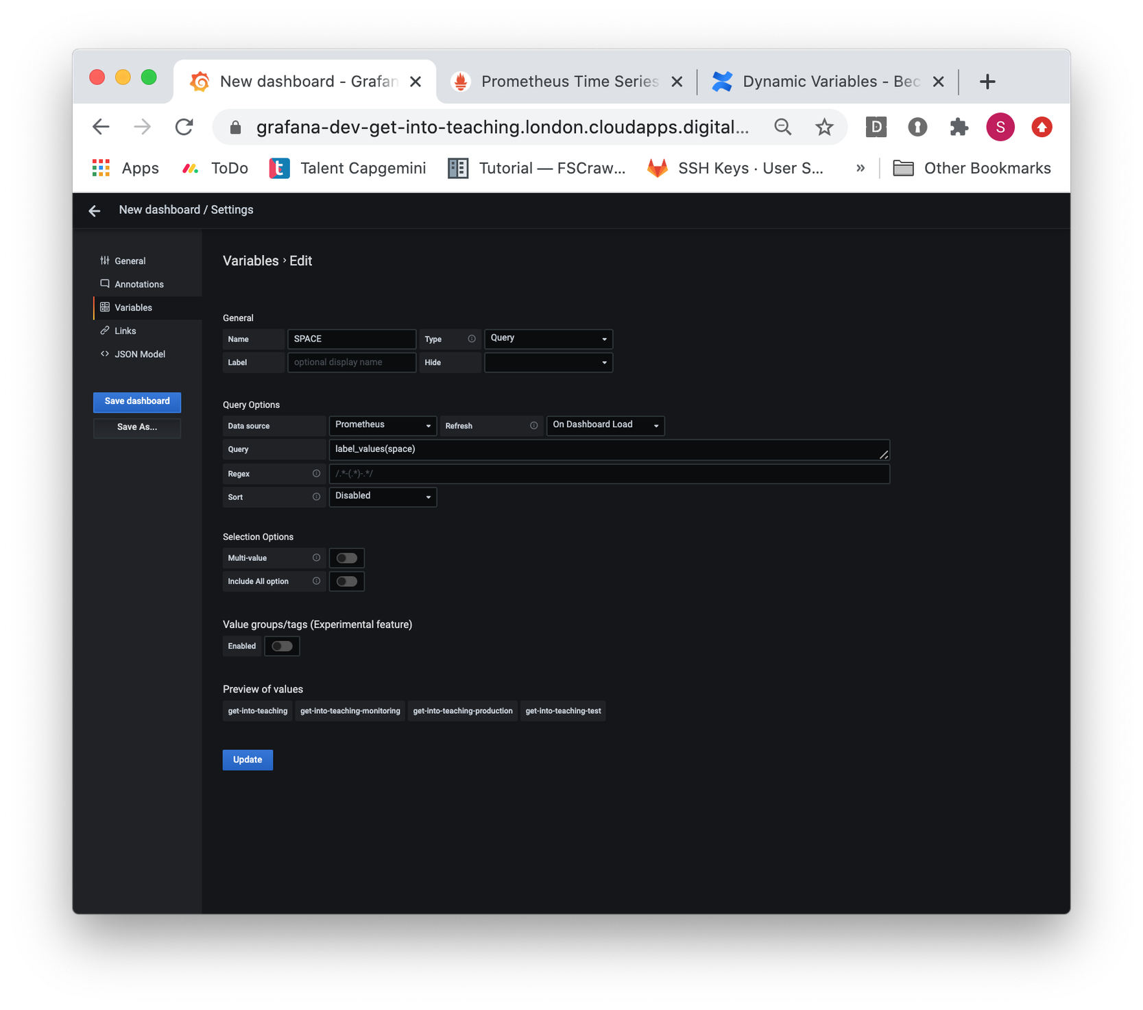 So we need to go to our dashboard and using the ‘COG’ at the top of the dashboard add a new variable. This should be a query variable and you should enter: